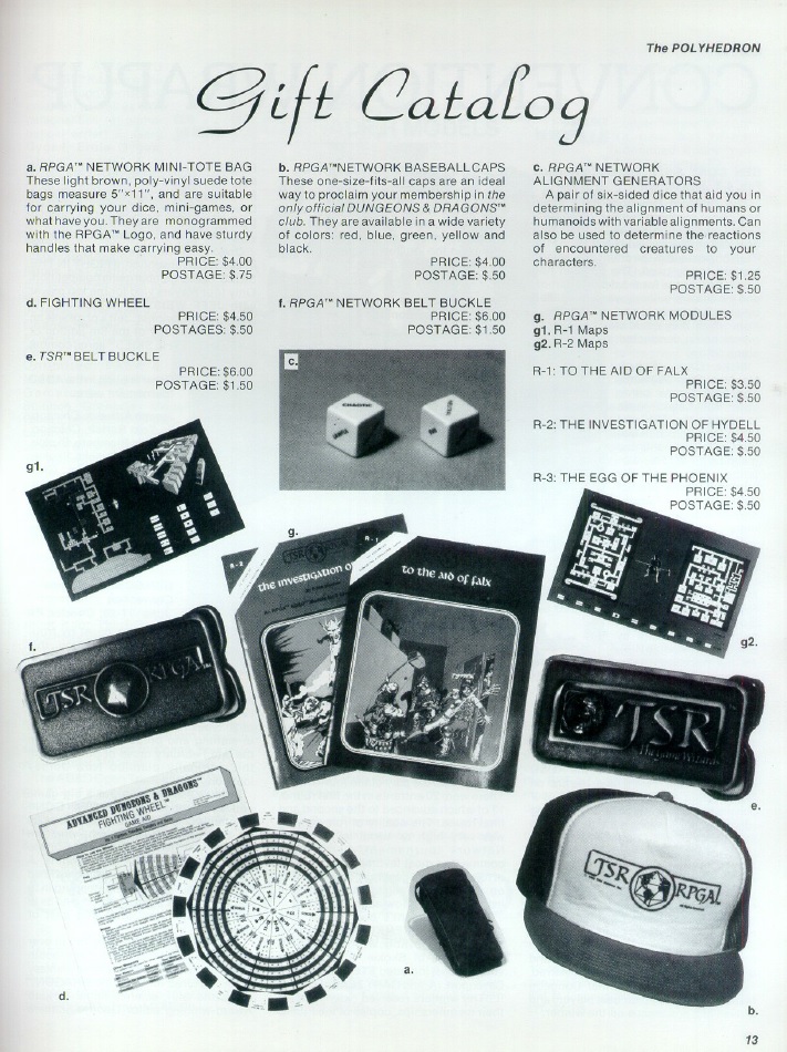 Spelling Bee covers Cleric spells this issue, with some clarifications on how they operate, and Notes for the Dungeon Master gives tips on how to roll up new characters after untimely demises. Particularly interesting are the Membership Drive adverts as well as the gift catalog where you could purchase some of those original RPGA modules for $4.50, which would today be worth hundreds.