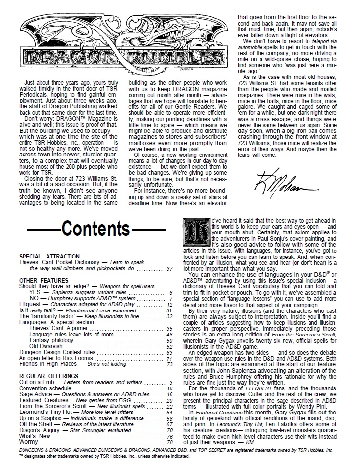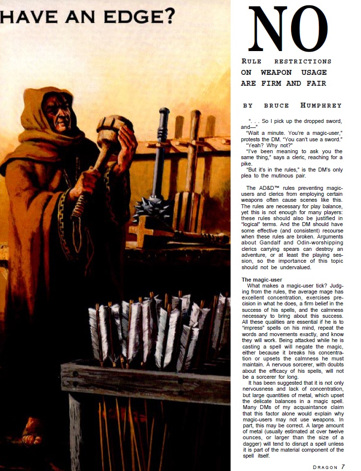 There’s an article debating if spellcasters should or should not be allowed edged weapons, another translating character from the Elfquest comic book into AD&D characters, new AD&D characters including the Marid and the Dao (which has already appeared in the Tsojcanth module), a Gygax penned addition of a bunch of spells for Illusionists (including such classics as Chromatic Orb, Alter Self or Dispel Magic). Keeping on the subject of Illusions Tom Armstrong writes about real and fake effects of illusions.