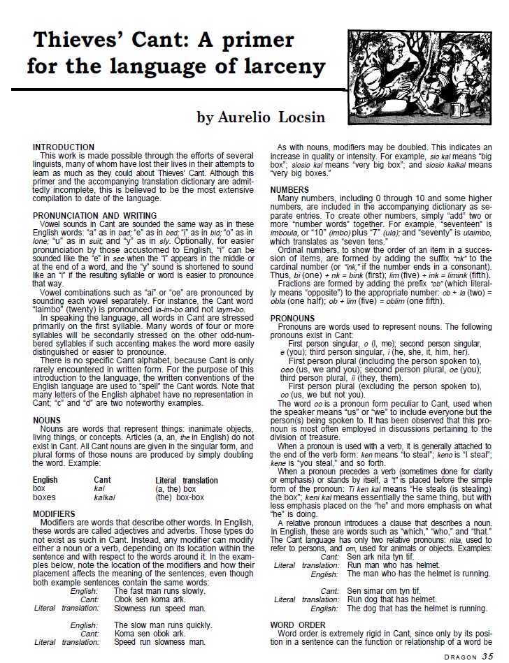 Then we get a whole special section on languages, which not being tied to any specific setting is a bit pointless. It includes a dictionary of Thieves’ Cant that you can cut out and fold in order to have a litte portable dictionary. There are also more general articles on including languages in your campaign and creating a variety of dialects within a party, another article covers Dwarvish as a language. Closing out the AD&D articles, Leomund’s Tiny Hut brings us a bunch of tiny creatures to challenge lower level characters.