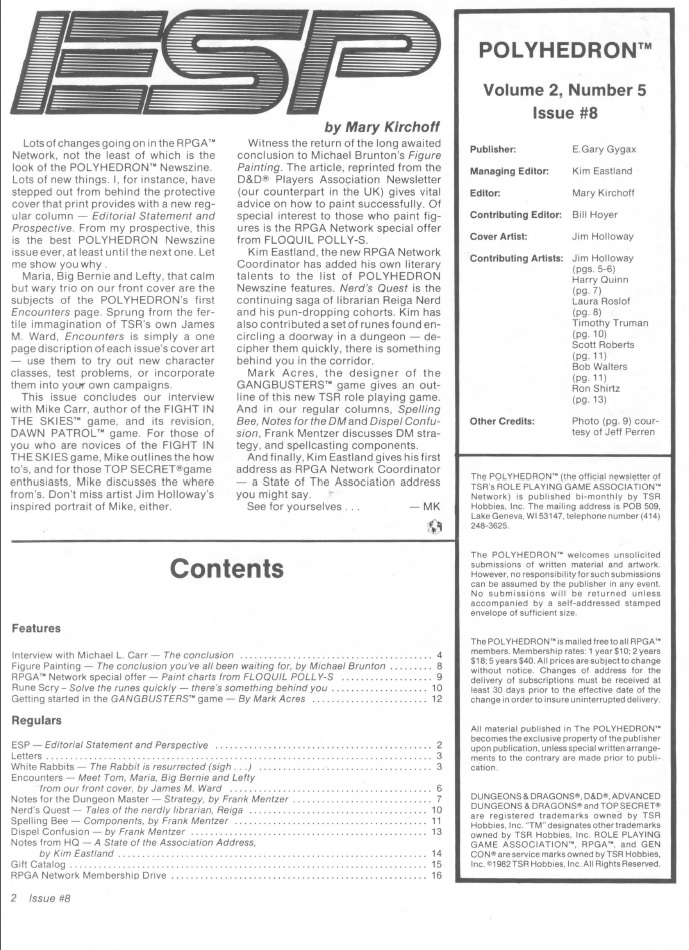 The RPGA newsletter returns with the second half of the Mike Carr interview as its centrepiece, mainly focused on his aerial combat game Fight in the Skies and the spy game Top Secret, both of which were published by TSR.