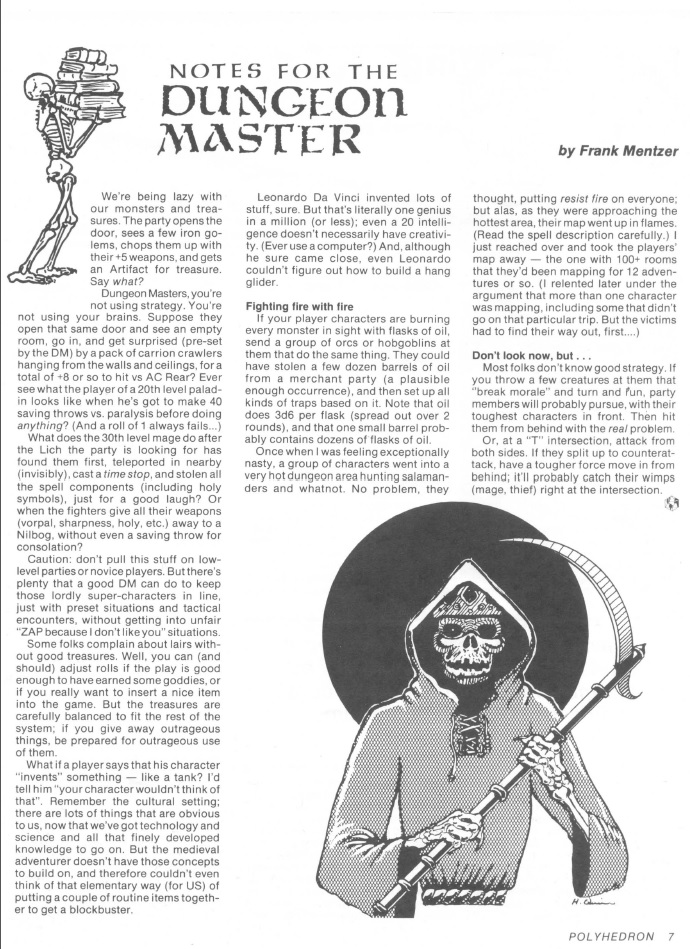 So there is comparably little D&D material in this issue, stretching only to 16 pages and featuring other TSR games, which means that most AD&D material is relegated to the regular columns such as “Notes for the Dungeon Master” and “Spelling Bee”, both by Frank Mentzer which had by now stepped down as editor of Polyhedron to go work full time on the upcoming Basic D&D sets.