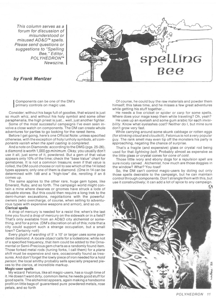 This issue Spelling Bee concerns itself with spell components and how they can be used and procured in the world as well as this can enhance the storytelling and roleplay qualities of the game, while allowing the DM to curb some of the more abusive spell use.