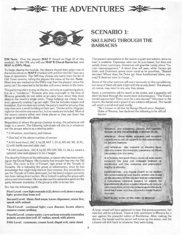 Designed for characters between levels 5-7 and set in the world of Mystara, it has the characters start the game in Rhoona, a town who’s ruling Duke has become a bit weird. Successive edicts impose weirder and weirder laws, and probed by a good cleric, Eric of Forsett, the characters have to investigate what is going on.