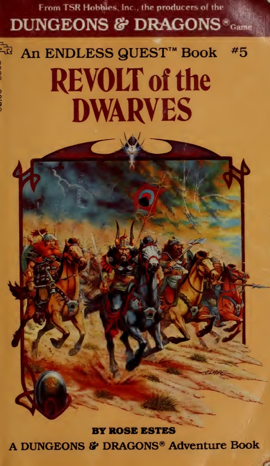 The fifth and sixth book in the Endless Quest series came out right as 1983 was beginning and in this case our hero (Galen) is thrown into the middle of a Dwarven led coup d’etat, with a bunch of revolting Dwarves revolting against the government. As his parents get kidnapped by the Dwarves, Galen has to find a way to warn the prince and raise an army to stop the revolution.