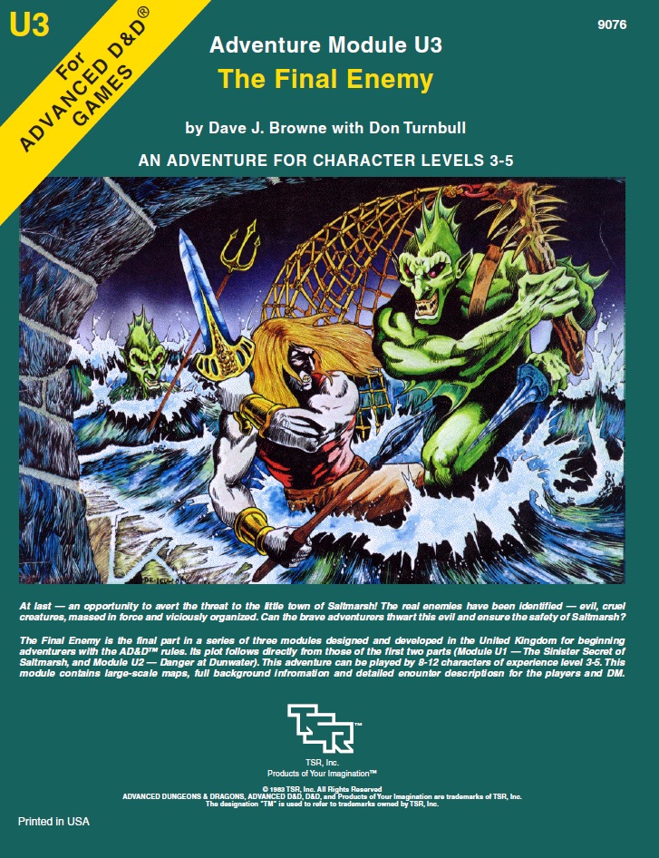 Finishing out the U series of Saltmarsh based adventures, this is probably and unfortunately the worst of the three modules. In this one the adventures have to basically scout out a Sahuagin HQ, with the help of the allies rounded up in the previous modules.