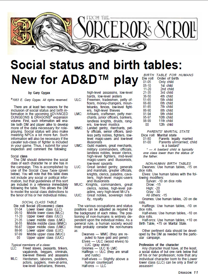 It starts off with Ed Greenwood’s Smith NPC class exploration, followed by an article on the relative speed of boats and ships. Then we get Gygax weighing in on how to randomly determine social class backgrounds for characters, an idea that has been around since the early days of D&D and some of the earliest Dragon and The Strategic Review publications, but which now seems to be going forward as a component in the next rule revision. Frank Mentzer contributes two articles taking this idea on an complementing Gygax’s article.