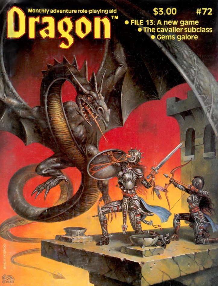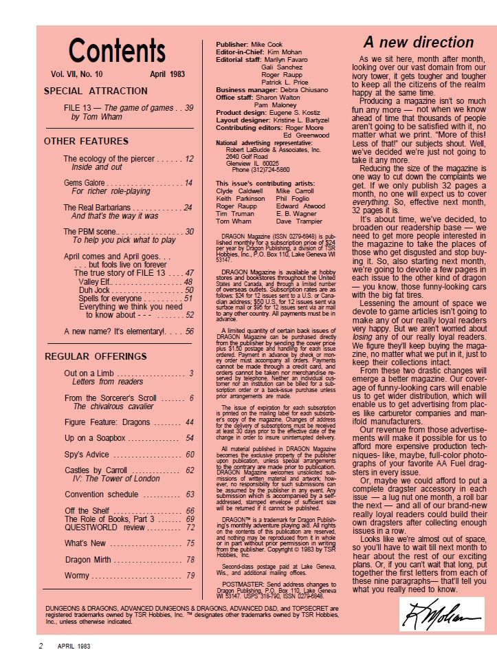 The April issue of Dragon can only mean one thing, a bunch of comedic articles sprinkled throughout the magazine, and that is certainly the case here. Beyond the very cool but serious Clyde Caldwell cover we immediately get a tongue in cheek editorial by Kim Mohan where he states that seeing as no one is ever happy with the magazine they are cutting it back to 32 pages and are starting to cover dragsters as a way to widen the audience of the magazine.