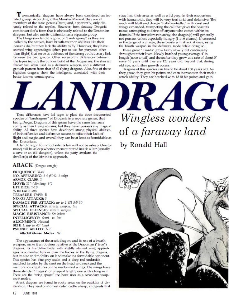This month also marks the 7th anniversary of Dragon magazine, which usually means Dragons! and the magazine doesn’t let us down, introducing us to Landragons, wingless cousins to the more famous dragons. There’s plenty of other stuff there, though and Gygax gives us an article on Warhorse and barding (or horse armor), Leomund’s Tiny Hut column covers Bureaucrats and Politicians as NPC characters, and The Ecology Of… column covers the Bulette in an article full of puns on Moby Dick. We also get a homemade Combat Computer, a little device that you can use to determine base THAC0. Speaking of computers you also get a full BASIC program for character creation… have fun if you want to try it at home!
