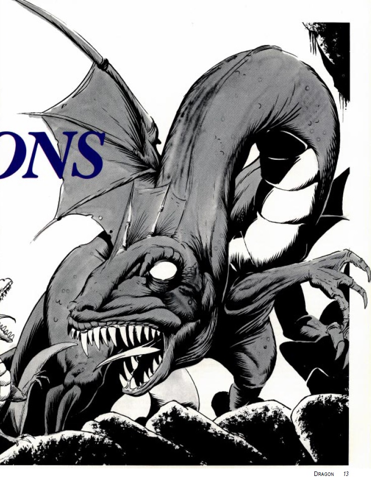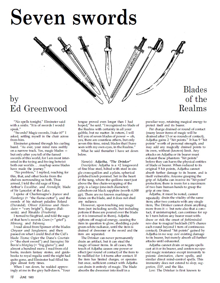Other articles cover what to do with player’s cash when it start accumulating and an article on the several levels of RP engagement of players. Last but not least, my favorite article here is Ed Greenwood’s Seven Swords: Blades of the Realms, in it Greenwood gives us the powers and lore of seven magical swords from the Forgotten Realms. These are perfectly usable even in 5e D&D, with just minor adjustments, and I think we get some of the first mentions and descriptions of the Harpers in this article. Great stuff.