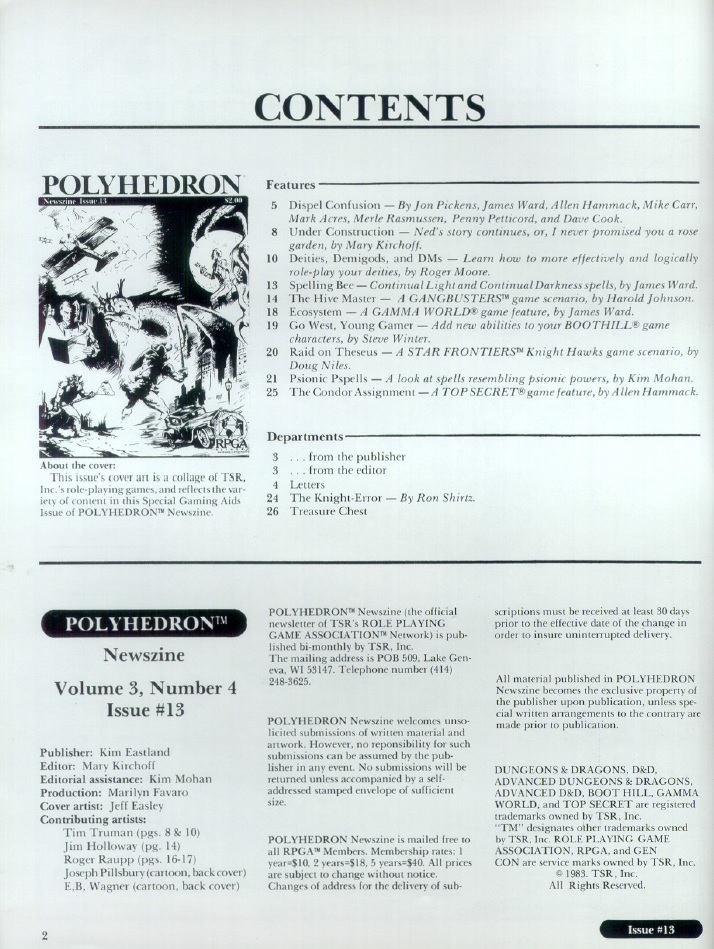 With a cover which features all the most successful TSR games of the time, with D&D/AD&D at the centre spot to highlight its centrality in the company at the time, this special issue of Polyhedron is exclusively dedicated to providing playing aids to readers.