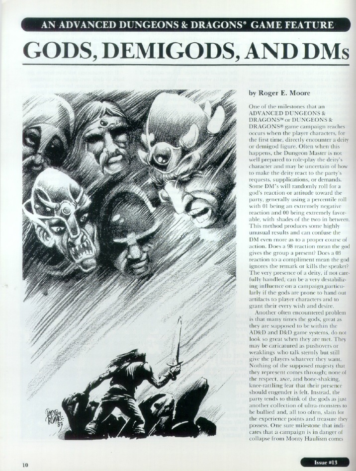 The regular columns are suspended this issue and are replaced with answers to questions and useful articles for players. Roger E. Moore returns to a theme that he had earlier covered in Dragon magazine, discussing the place of Gods and Demigods in AD&D, advising, wisely, that DMs should make spare use of them and not make them easily destroyable or destroyable at all, for that matter. He talks of how “god killing adventures” can be fun for a while but are really a game of diminishing returns, because where do you go from there? And what’s the point? Gods and Demigods are a lot more interesting as NPCs than as monsters, and if you want to use them as a villain it makes sense only as the ultimate, final boss of a long campaign that pretty much ends after that, rather than just another thing players can steamroll.