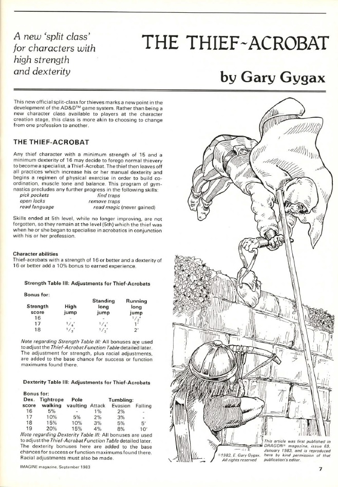 Centred around a reprint from the January ’83 Dragon magazine, this isn’t really the most exciting issue of Imagine, the TSR UK publication, this is the reprint of the Thief-Acrobat subclass by Gary Gygax, which also gives a theme to this month’s cover.