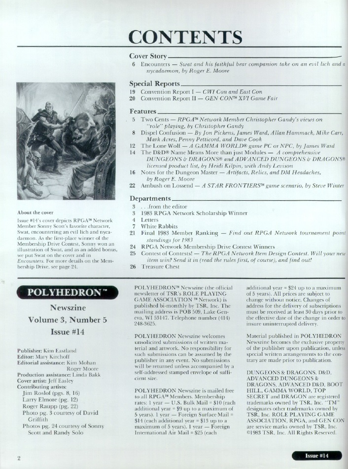 This issue also makes a point of publishing articles by RPGA members, such as one on “Role” Playing, about how it’s rewarding to actually play a role in the game rather than just see it as a dice rolling game. Another article, this time by Roger E. Moore on DM’s being sparing with Artifacts and Relics is also pretty good.