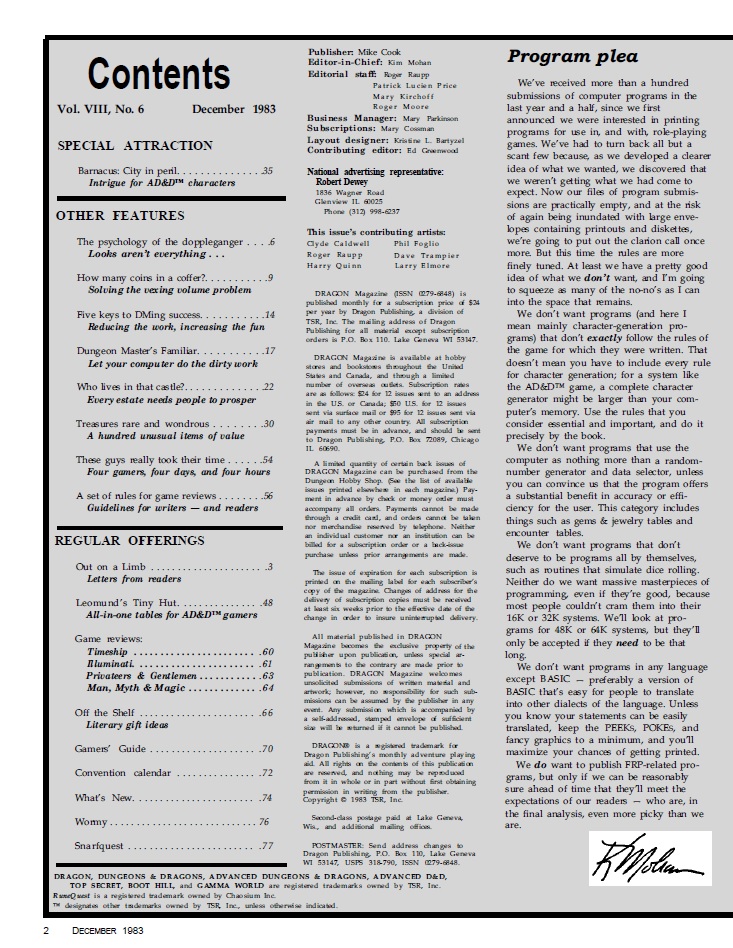 Mike Beeman brings us a general interest article with tips on DMing, and Ed Greenwood gives us another d100 list of trinkets and treasures to spice up your adventure, some really good stuff here! The mini module is Barnacus: City in Peril for levels 1-5 and Len Lakofka brings us a bunch of alternative combat charts, thanks Len! As usual we finish with our usual comics pages with What’s New by Phil Foglio, Wormy by Dave Trampier and SnarfQuest by Larry Elmore.