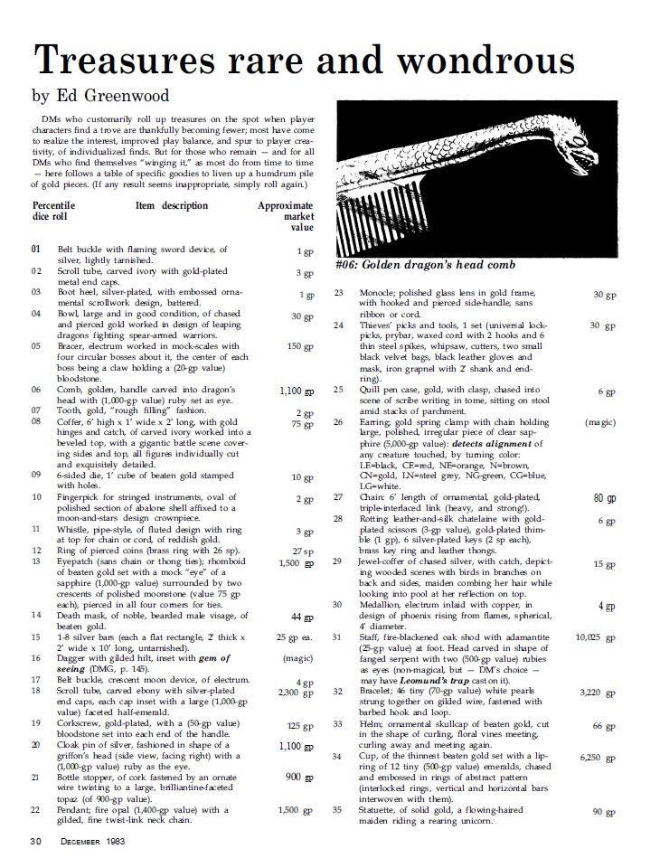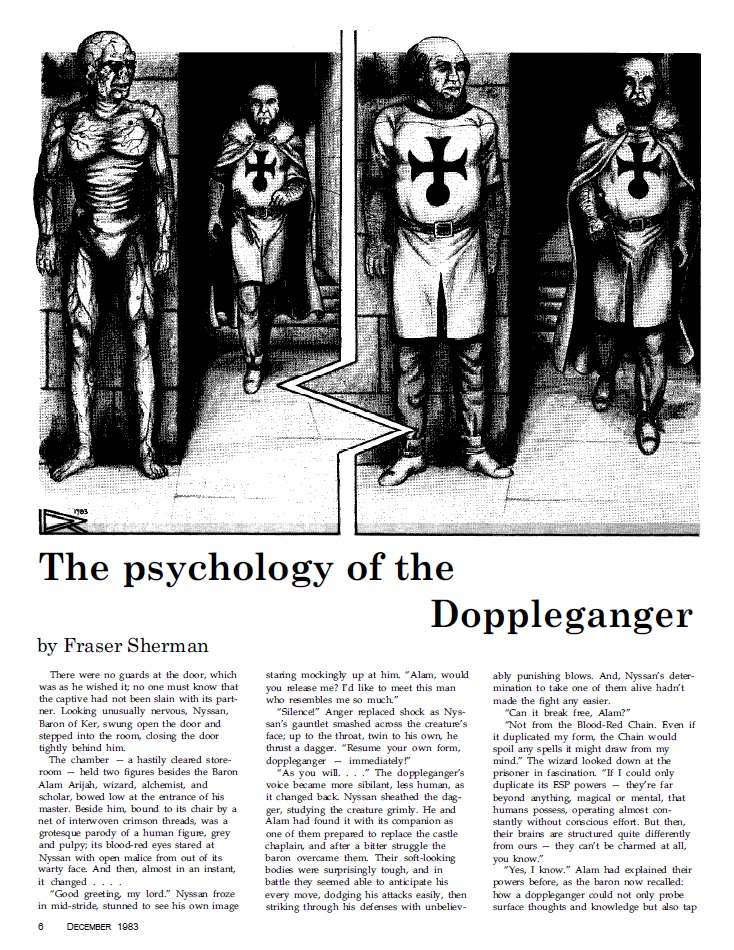 Although the cover is really the highlight in this issue, there is still plenty of good stuff on the inside of the magazine, starting out with the Psychology of the Doppelganger article, and the usual articles covering the minutiae of D&D with subject like what the volume of gold coinage is. We already knew all about the weight, but now we get to find out how many coins are in a coffer as well as how different materials have different volumes and so on. “Fun” stuff.