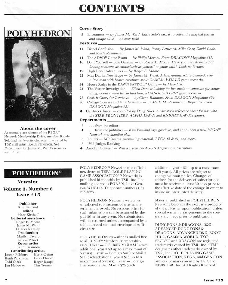 The last RPG Association Zine of 1983 marks an important moment for the magazine as it greatly expands its size. With a cool cover by the late, great Keith Parkinson, one of the rewards for the membership drive when players who got the most members for the RPGA would win their favorite player characters illustrated by a TSR artist, the magazine is now almost double the size.