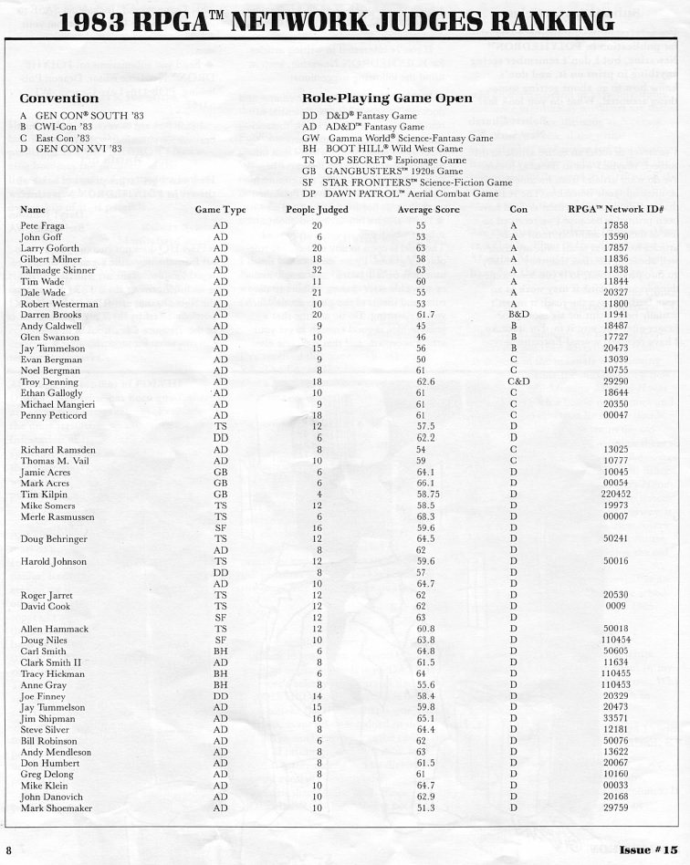 The magazine contains the Judges Ranking for 1983 which ranks DMs and it’s fun to see some famous names on that list, such as Douglas Niles, Troy Denning or Tracy Hickman. Articles include a mini-adventure based on the cover drawing in Encounters, some reprints from Dragon, such as the AD&D exam, and articles on Solo RPG playing and High Level adventures for AD&D.