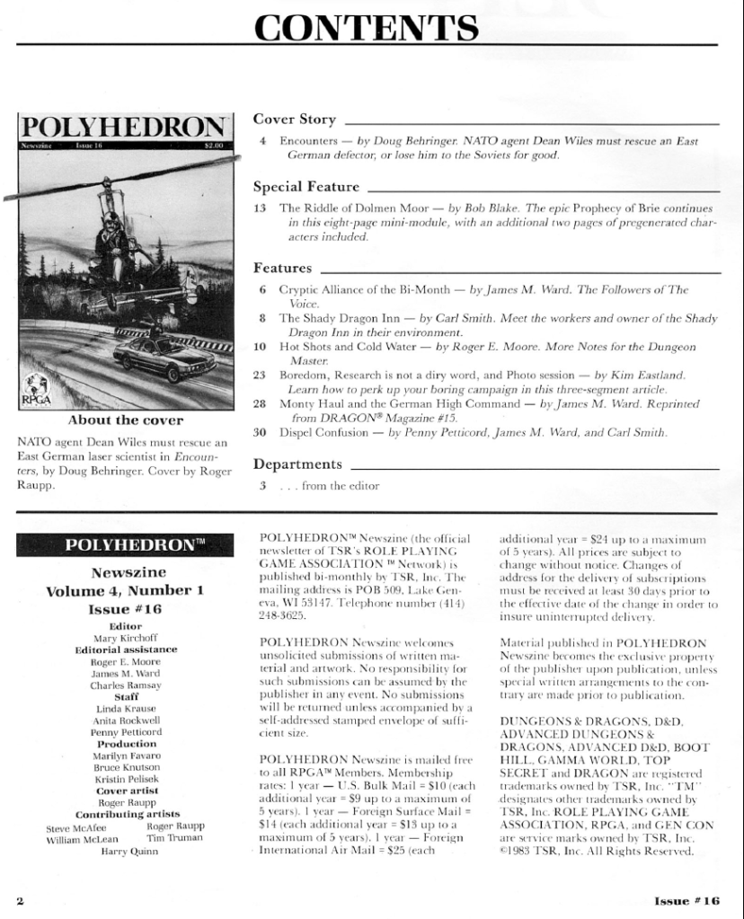 The new and improved Polyhedron (new since last issue) has some more news for readers, that is the fact that it will start publishing mini-modules on a semi-frequent basis. This is because TSR has kind of given up on selling RPGA branded items, and therefore all the RPGA modules are out of the market and there is no place to sell them or to continue their story.