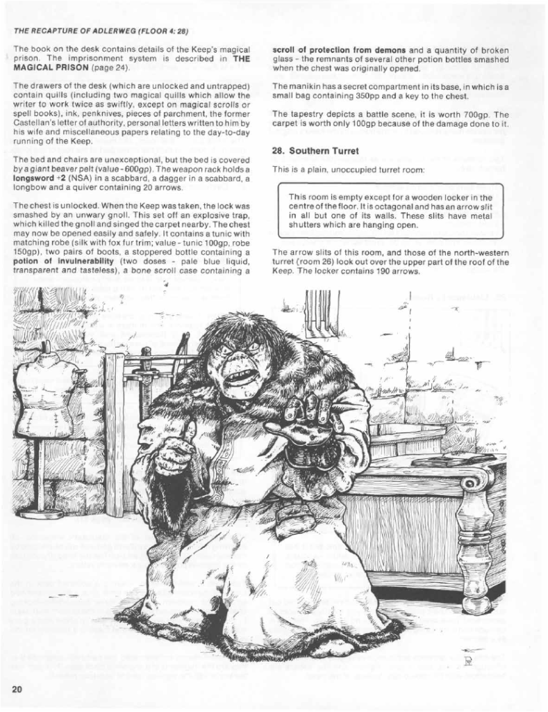 As a module it looks pretty cool, but really only half a thing, with UK2 pretty much a prerequisite for this adventure, the art by Pete Young is pretty grotesque, but in a way which I quite enjoy, with a real old-school feel to it and a griminess that is characteristic of UK products in a way which was absent from the more polished US productions of this time.