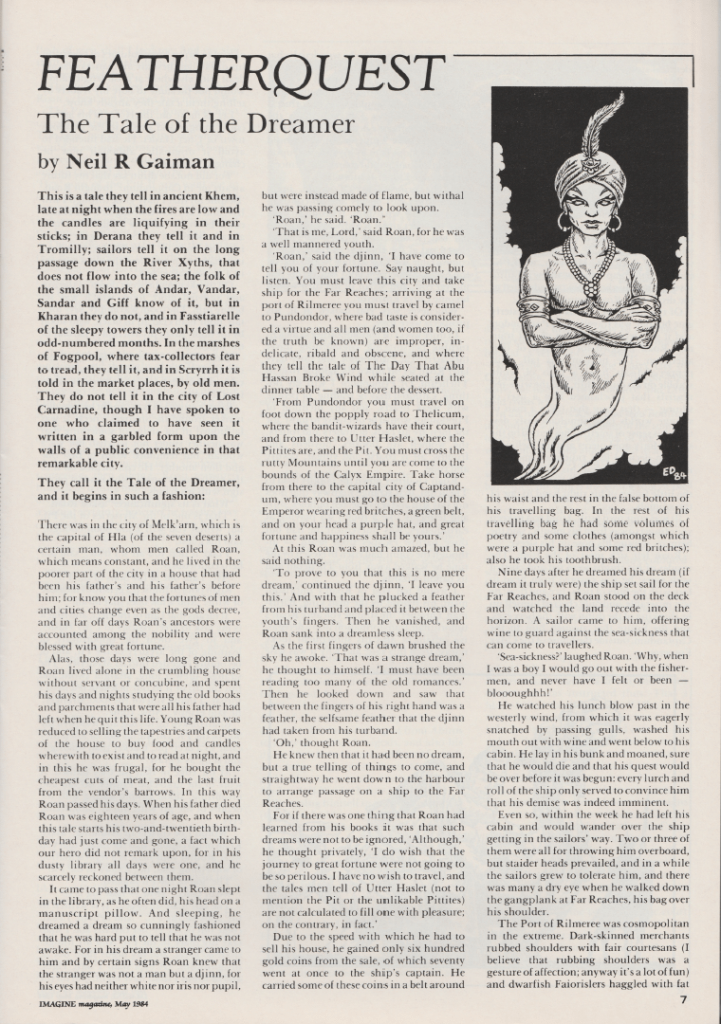 However this magazine issue also deserves a place in history as it contains the first ever published story by none other than Neil Gaiman, Featherquest: The Tale of the Dreamer, a story with a dream-theme that really points toward some tales in that little known comics and now TV series known as… The freaking Sandman. There’s also an article about insane swords, enchanted D&D weapons with “peculiar” personalities, but honestly in this issue it’s really Talbot and Gaiman that are the highlights.