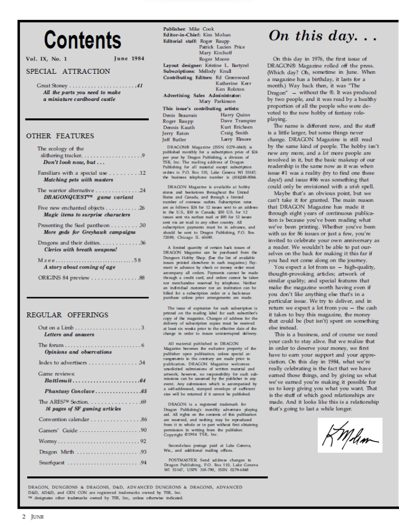 In terms of D&D content we get the Ecology of the Slithering Tracker by Ed Greenwood, a large article on familiars for magic users, some new enchanted objects, which are always welcome and as Kim Mohan states in the editorial, something that together with new creatures is a constant request from readers.