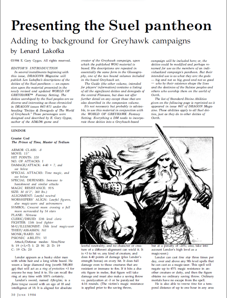 Lastly we have two articles about gods, one adds the Suel pantheon to the Greyhawk setting, and the other covers Dragon religion beyond the “Tiamat vs. Bahamut” that we all know about and kind of invents the “Dragon cleric”… a concept that really isn’t frequently used. Beyond this we have all the usual columns and comics.