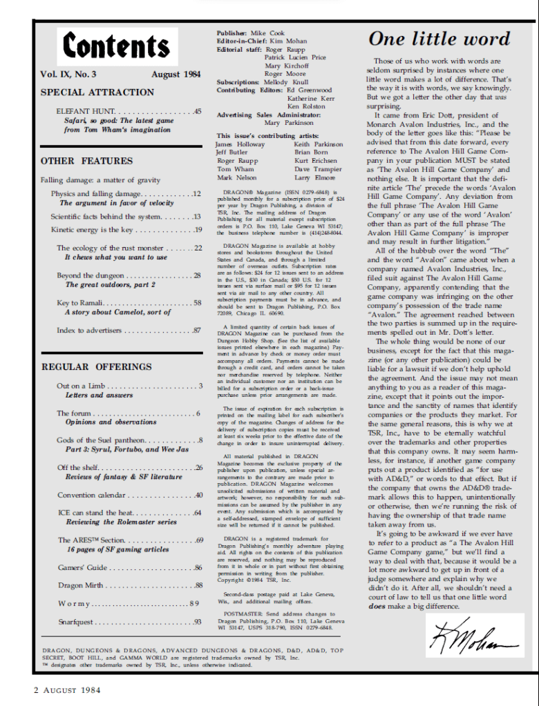 With a cover by James Holloway, issue 88 of Dragon has a couple of interesting and unique articles in it, some about D&D and others not so much. It’s worth noting in passing the Tom Wham game Elephant Hunt, a typically humorous game that takes up the centre pages of the magazine and which is also, unfortunately the last game that Wham contributes to the magazine, which will focus increasingly on the well established properties of TSR like D&D.
