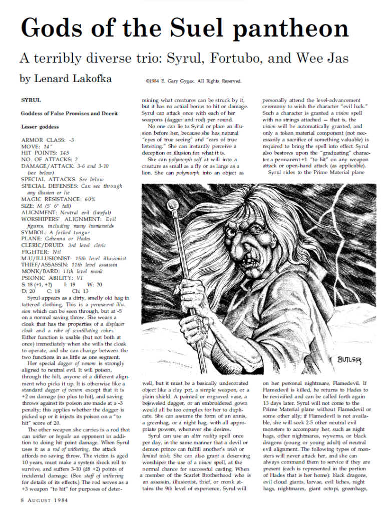 In the realm of D&D we have some continuation from the previous issues, such as the second part of the article about taking adventures outside the dungeon and making the wilderness a more exciting place in which to play, as well as the continuation of the Len Lakofka articles on the Gods of the Suel, from the Greyhawk campaign setting, covering Syrul, Fortubo and Wee Jas.