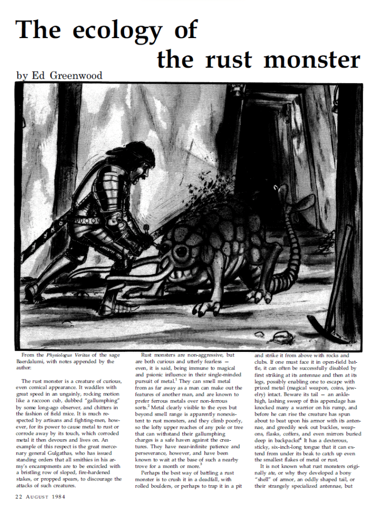 Other articles cover the physics of fall damage with a couple of articles with competing opinions on the subject complete with mathematical calculations and everything for those DMs into the nitty gritty of the thing, and lastly Ed Greenwood brings us the ecology of that unique D&D monster, the Rust Monster, explaining how the whole thing works and how they live their lives. Another fun issue.