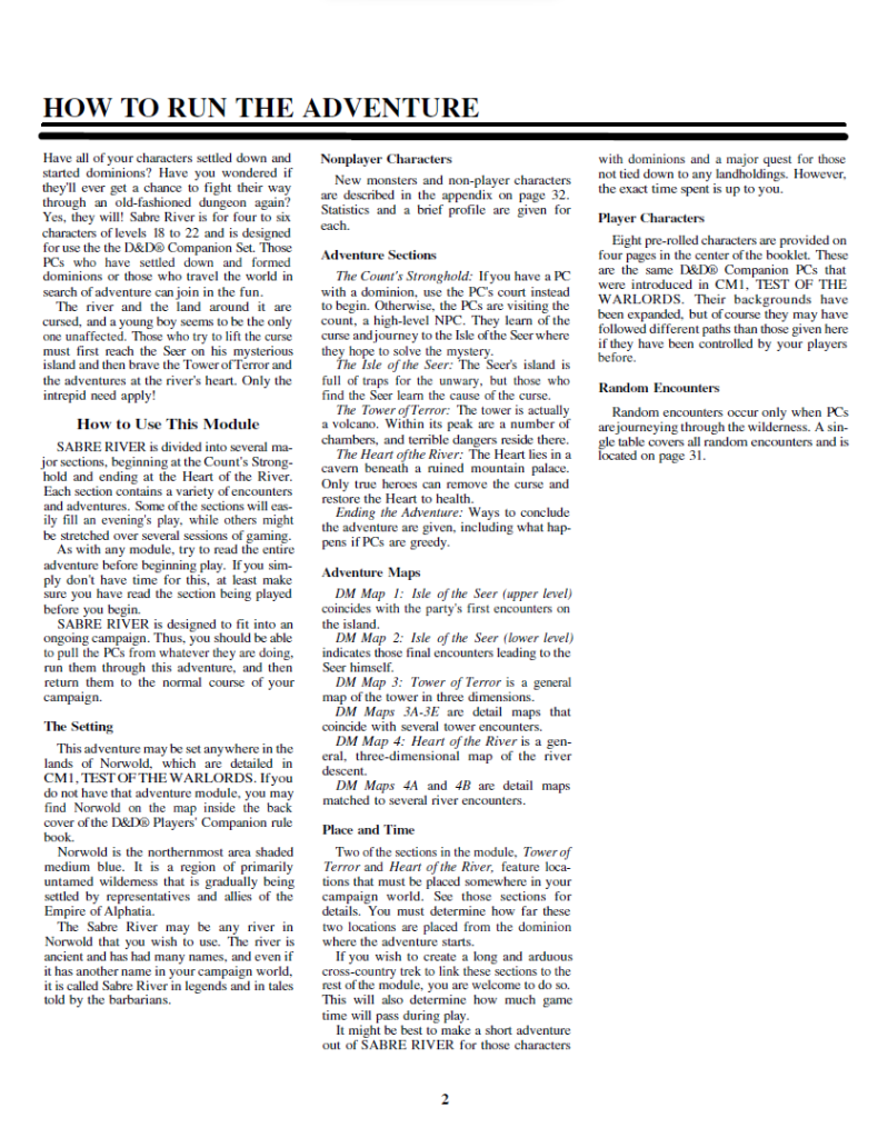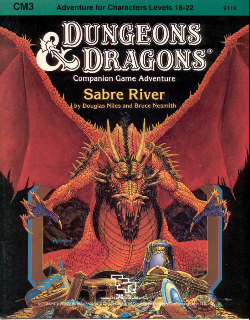 The third module designed for the Companion set of the BECMI Dungeons and Dragons, this one seeks to bring players back into dungeon crawling at their high level. The previous CM sets had focused on the building up of dominions for characters to rule over and dealing with threats to that kingdom. Sabre River gives the high level party a reason to get out of their stronghold and figure out what is going on elsewhere, eventually doing some dungeoneering on the way.