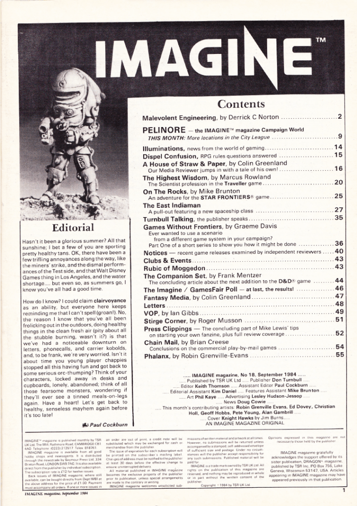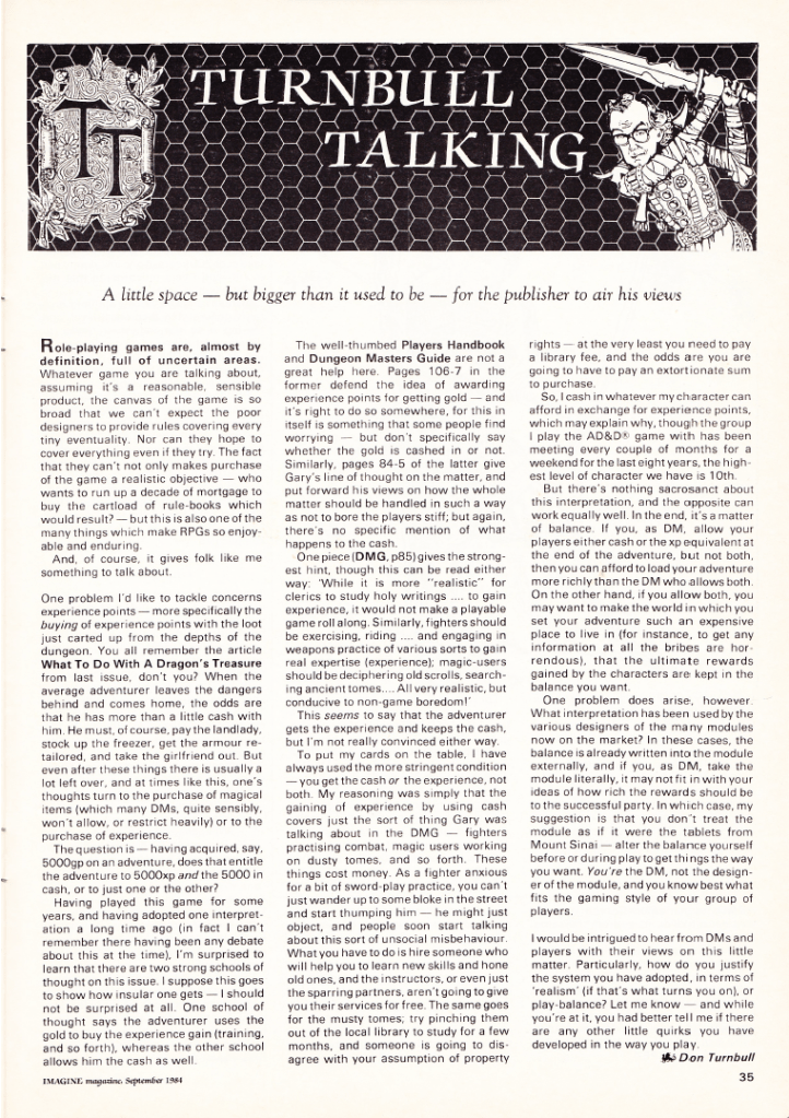 Other articles include more information and even pretty good maps of buildings and towns for the Pellinore campaign setting, the setting where all Imagine DnD modules are set, another take on the Samurai class by Graeme Davis and a column by Don Turnbull about the connection between XP and GP that was so essential to early editions of the game. Namely, Turnbull explores the idea of buying XP through GP, he defends the idea that each XP is worth 1 GP, meaning that you have to spend the money to get the experience, and not that you get 5.000 XP from getting 5.000 GP. In Turnbull’s system if you get 5.000 GP you can invest that money in training and, imagine, keep 2.000 GP and spend 3.000 of that money in training which nets you 3.000 XP. That’s pretty interesting stuff, actually.