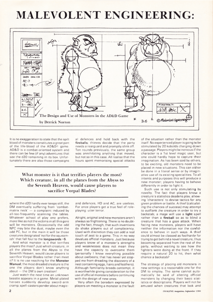 In terms of DnD content the magazine starts off with a pretty good and extensive article on designing and using your own monsters in ADnD, covering most aspects of monsters from movement and treasure to intelligence and psionics. If you were (or are) trying to create your own special beasties for AD&D this could be a pretty useful article.