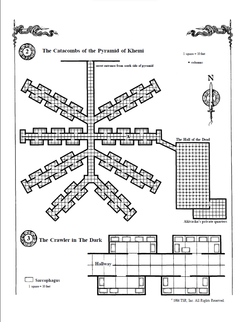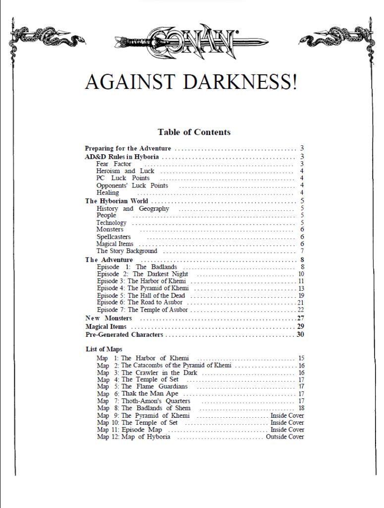This uses regular AD&D rules, but much like CB1 it adds some extra tidbits to attempt to capture an hyborian feel to the adventure. There are, for example, no clerics here, making the game harder in terms of healing, but to compensate there is an enhanced recovery system. There are also systems for Heroism, Fear and Luck all of which add to the Howardian sword and sorcery feel of the module.