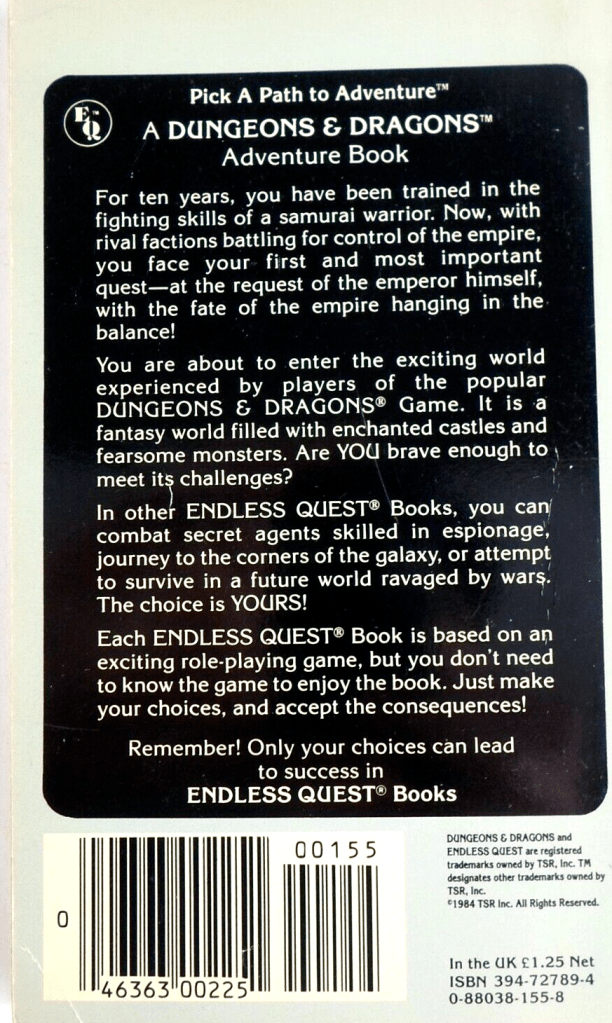 A second Asian inspired D&D Endless Quest book, after Duel of the Masters, this one is more explicit about its setting as instead of following an established D&D class such as the Monk, it goes into a more strictly East Asian setting with Samurais and Ninjas showing up.