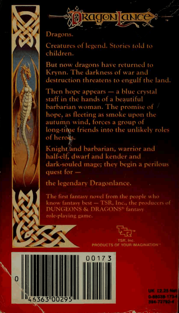 This marks a real sea change in D&D in general and in TSR’s business model in particular. This was the first novel based on D&D material to come out since Andre Norton’s Quag Keep back in 1978, but while Norton’s book was an independent story based on the game, this first volume in what would become the Dragonlance Chronicles is part of a concerted business and storytelling strategy by TSR.