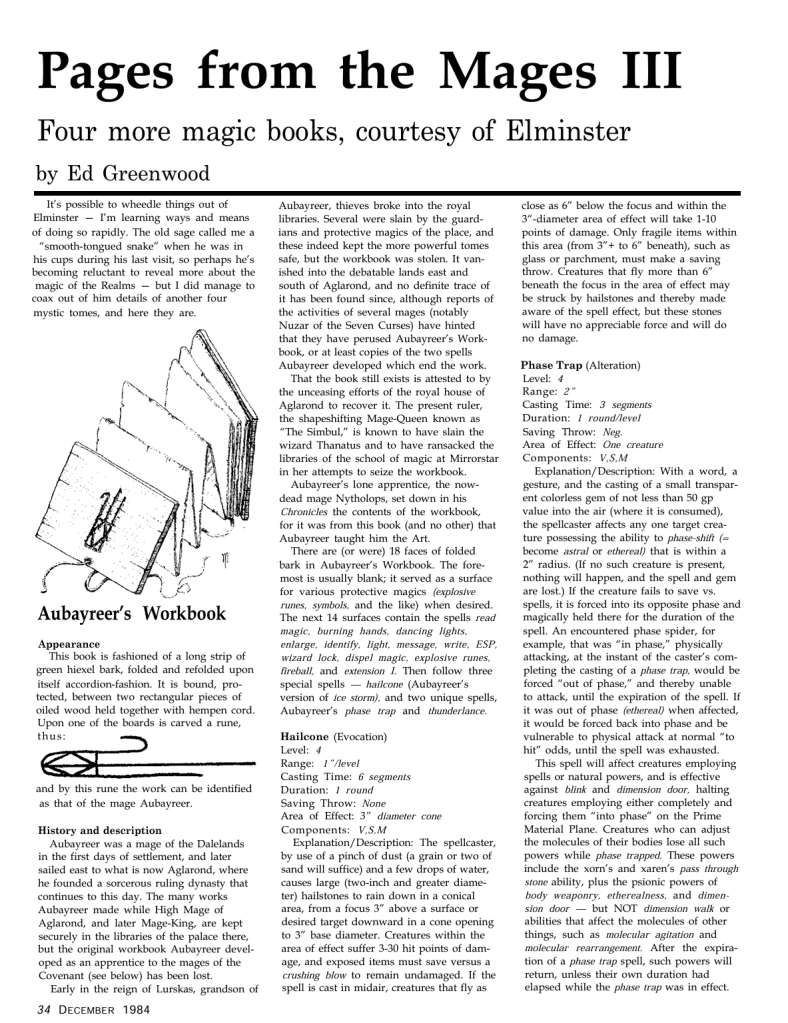 Other interesting articles include two Ed Greenwood contributions, one on the Ecology of Ettins and another on magical books, the third entry in Elminster’s reports from the Forgotten Realms’ grimoires. There’s also the usual D&D module, this one entitled The Sword of Justice.