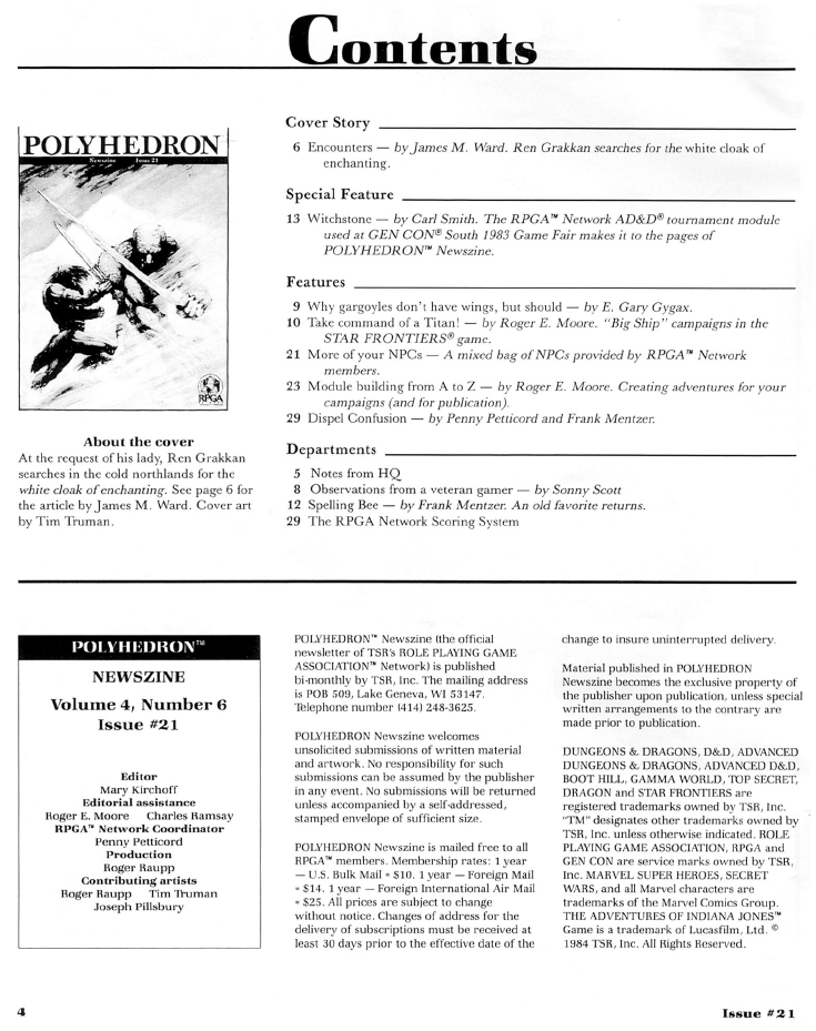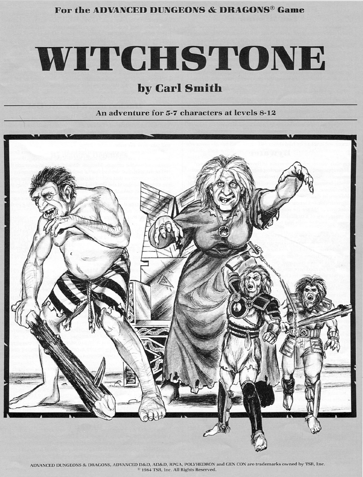 Other than that we get some Gygax column reprints, some articles by Roger Moore on creating adventures for campaigns and for publication, but the central piece of the magazine is the competition module Witchstone by Carl Smith, first used in the 1983 GEN CON South Games Fair, the kind of things which is the bread and butter of Polyhedron and the RPGA as the competitive D&D association.