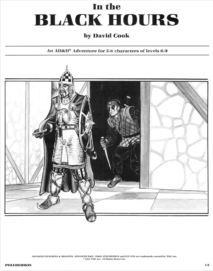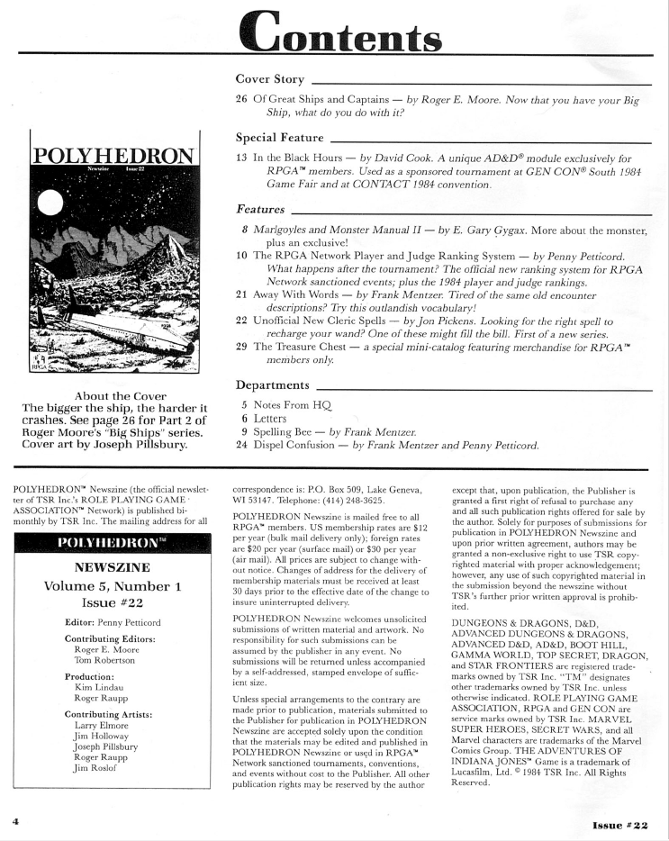 D&D content includes the usual centerpiece module, this time In the Black Hours by David Cook, first used in Gen Con South 1984 and now reprinted here for all those who like their D&D competitive. Gygax contributes some new monsters in an article rectifying some omissions from Monster Manual II and clarifying the Marlgoyle. Gygax shows up again in the official Judge and Players rankings for 1984, being the highest ranking game judge at level 10.