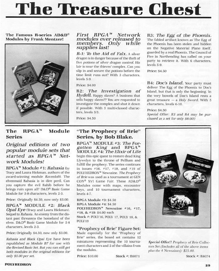 Other articles include some new, but unofficial, Cleric spells and a catalog for ordering some RPGA swag. If you were smart you would have been snagging as many of those R-Series modules as you possibly could for $4.00 and keeping them for a rainy day as each of them would be worth in excess of $1k today. Talk about inflation.