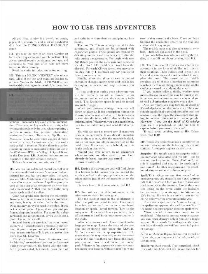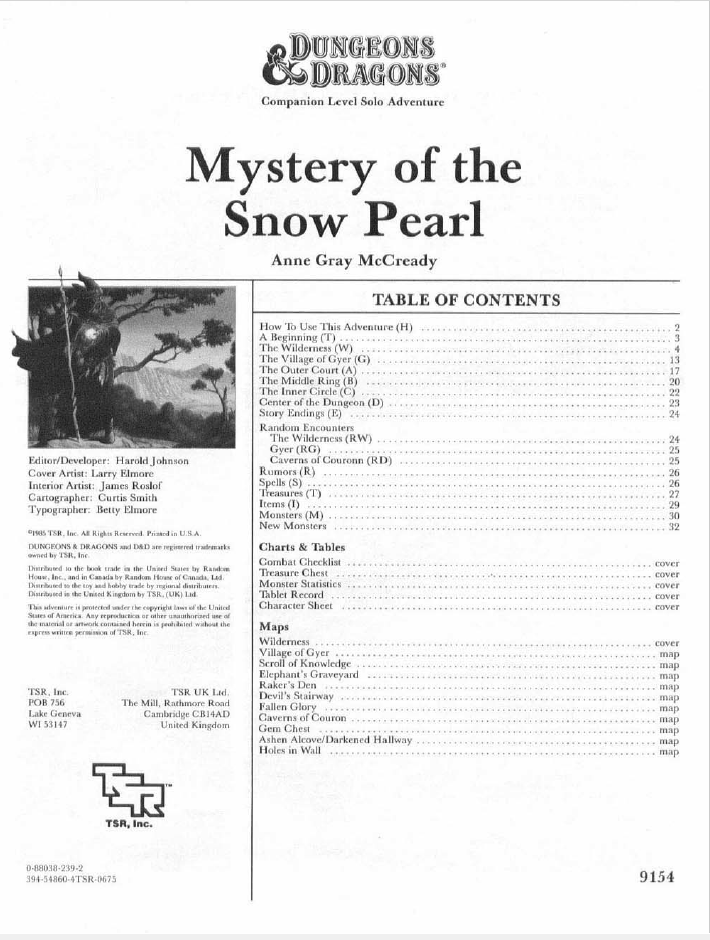 The story, as in the case of most solo modules is not very complex, you are an elf who needs to retrieve one of the magic white pearls that protect your town of Tarylon, in order to do this you need to challenge a wizard (the guy on the cool Larry Elmore cover) and pass his riddles and tests. It’s notable that this is one of the very few women written modules of the period, being Anne Gray McCready’s first contribution to modules. She had been hired some years earlier as a Copy Editor.