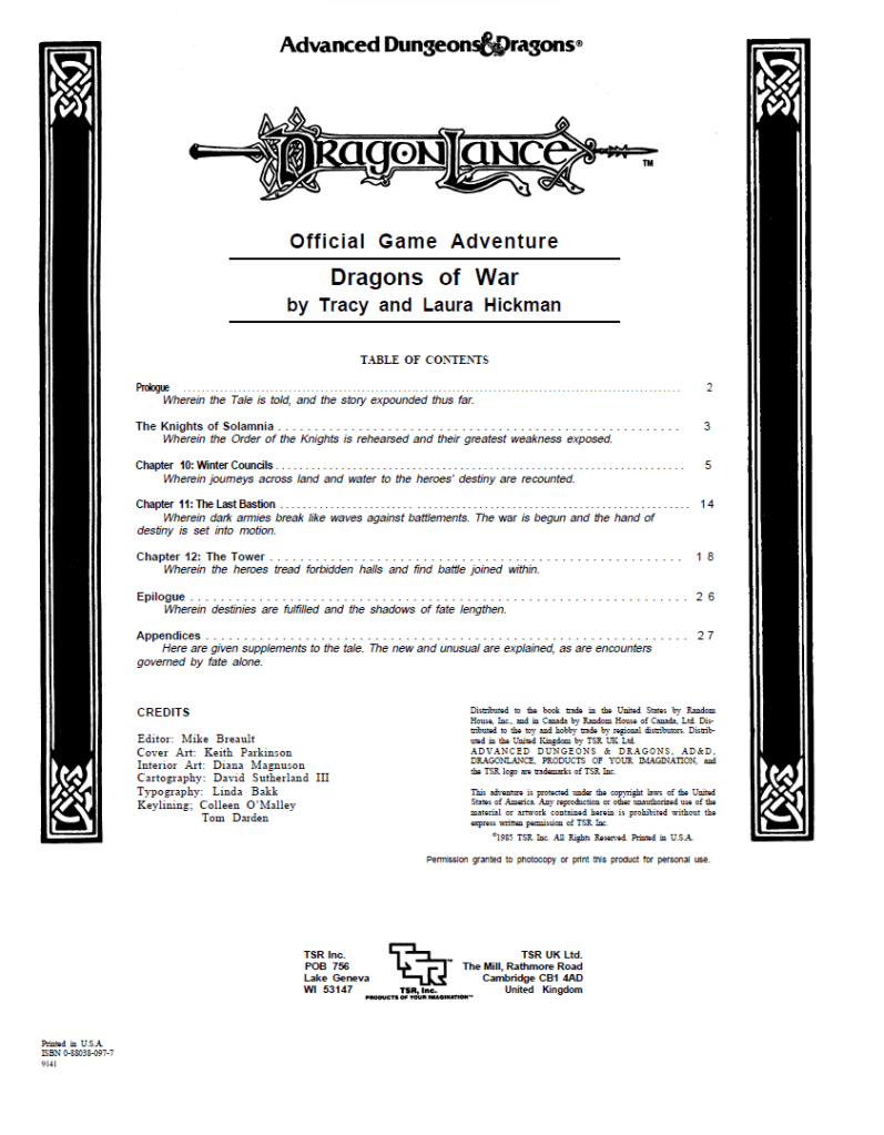 Focused around the last part of the story retold in Dragons of Winter Night, the battle at High Clerist Tower, this 8th Dragonlance module makes heavy use of the new Battlesystem wargaming rules to bring to life epic battles.
