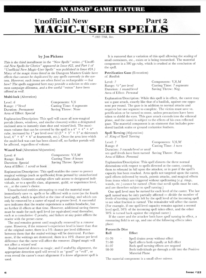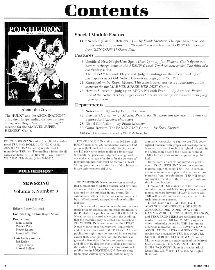 In this issue the centrepiece is The Needle Part 2, the second part of a competitive adventure by Frank Mentzer, but we also have a bunch of unofficial Magic-User spells and the usual column on rules questions, game reviews and so on.