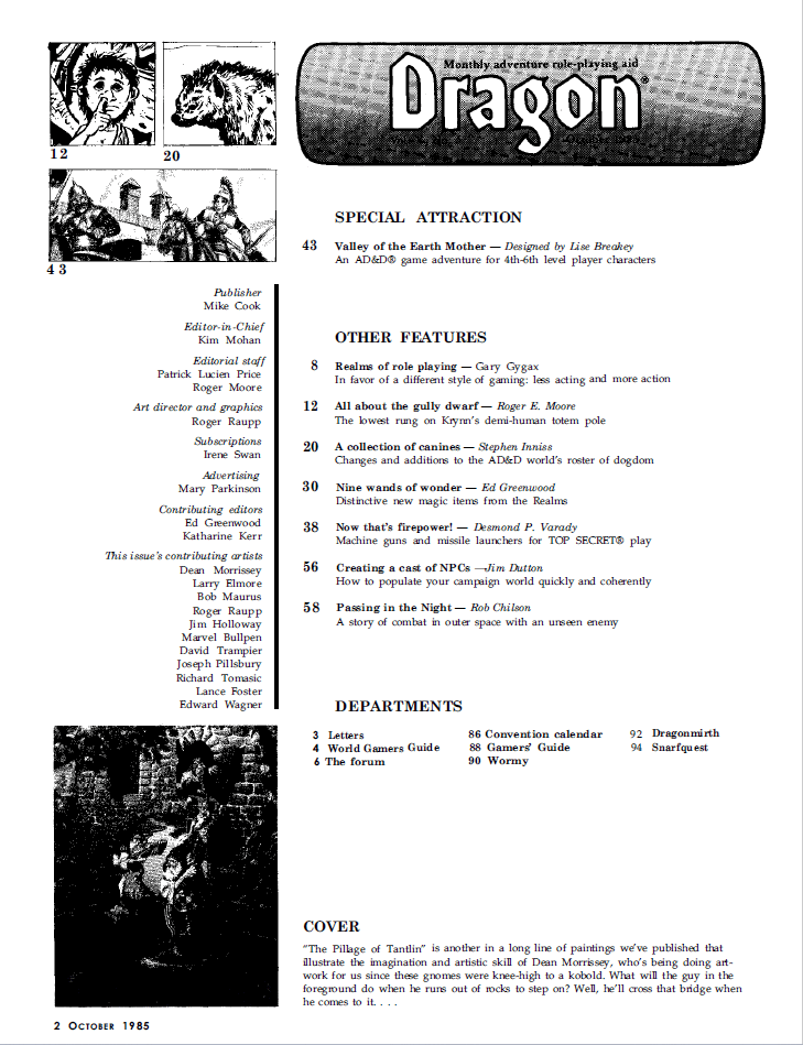 Welcome to October 1985 and we start off, as usual, with that month’s issue of Dragon magazine. Centred around an adventure for players of 4th to 6th level, called Valley of the Earth Mother, the main points of interest are actually a couple of really good (or at least interesting) articles that are worth your time.