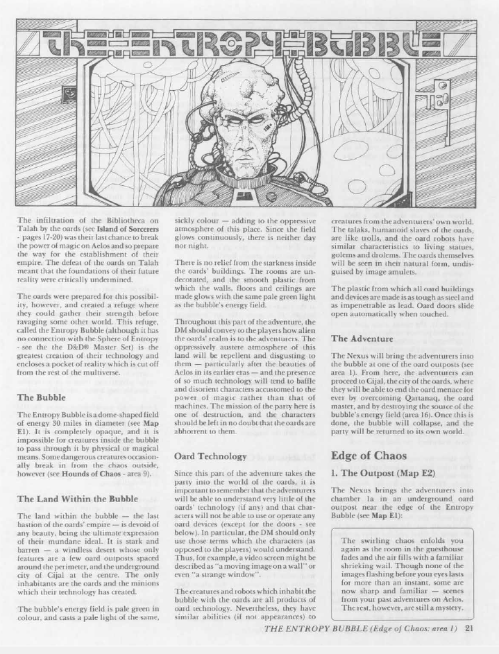 The world in which our characters start is experiencing a bunch of weird events, there is a clear disruption in the normal workings of physics and they have to explore several times and places in order to fix the chaotic state of things, they go to a primitive land, to a magical place, to a classical greece type are and ultimately they will have to go to a distant planet, this also being one of the few modules that mixes Fantasy and Science Fiction, to find the source of the disturbances.