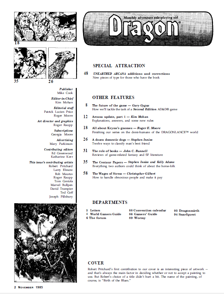 In terms of the second article which feels a bit bittersweet is the long first part of an errata for the Unearthed Arcana book. A book intended to make people not be dependent of all those articles that came out in Dragon magazine, now feels the need to print a bunch of correction in that magazine because there were so many errors in the book, ultimately defeating the purpose of Unearthed Arcana by making players and DMs again dependent on stuff published in the middle of Dragon magazine. Oh well.