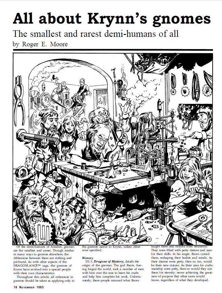 A bit of a bittersweet issue this one, although it has plenty of the usual cheerful stuff with a great article on Dragonlance’s Gnomes and another really long one on Centaurs, it also focuses two articles on something that will never be and on something that was but kind of failed in its purpose.