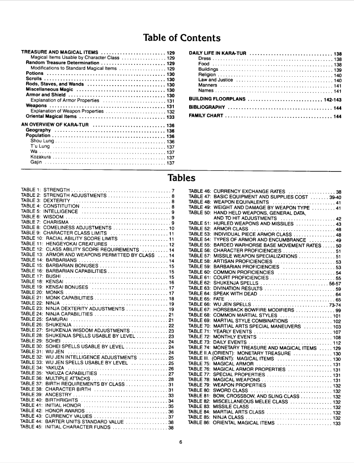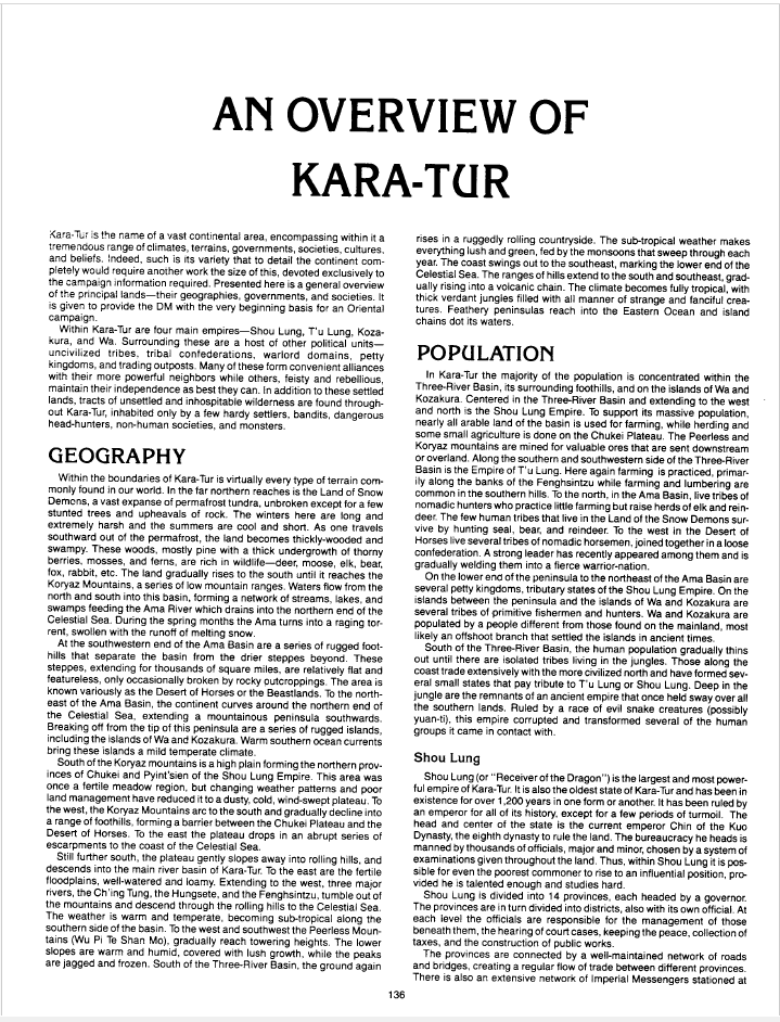 In second place, this volume gives birth to Kara-Tur, a campaign setting originally imagined as being part of Greyhawk, but which was published here as an independent setting, making it the fourth official original AD&D setting after Greyhawk, Ravenloft and Dragonlance (there were some non-original settings already such as Conan and Lankhmar and a semi-official one in Imagine magazine’s Pelinore). Kara-Tur wouldn’t last through the end of the decade as a stand-alone setting, eventually becoming part of the Forgotten Realms, later in the decade. A really interesting volume!