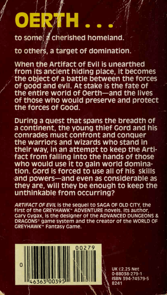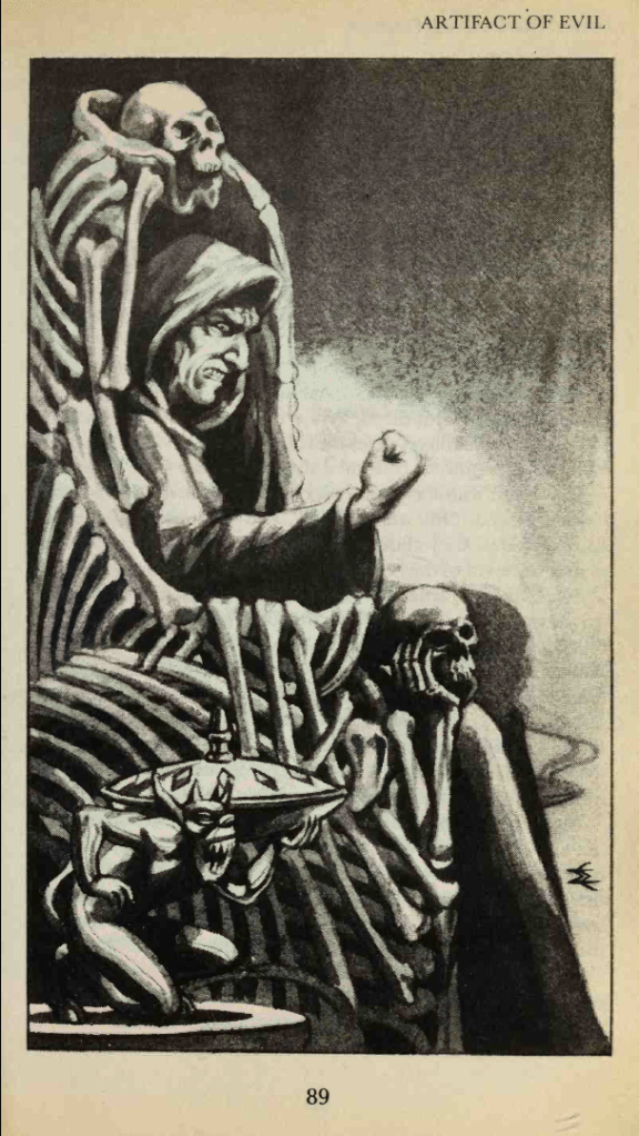 The plot is also not much to write home about, in order to compensate for the mainly city set first book, Gygax takes us on a tour of Oerth, but it’s such a wide ranging tour that you never really develop a sense of attachment for any place. There’s an artifact of evil which demonic forces want and “good” forces which include Gord as mates as well as Mordenkainen, Melf, Bigby and other Gygaxian home game characters, need to get it first to avoid disaster. Much too much happens in this novel while also very little substance happening. It would have really benefited from a good editor and/or a flowchart. Still, good cover by Caldwell and interior illustrations by Easley!
