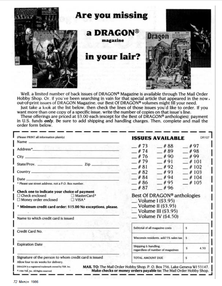 Back Issue Mail Order Form from Dragon #107 (March 1986)