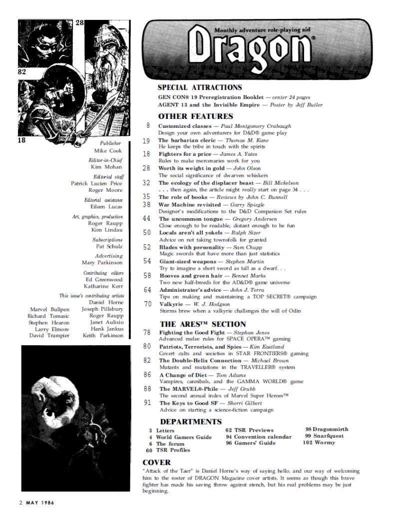 As always we start a new month off by covering the issue of Dragon, and this time we get another classic cover, by new cover artist Daniel Horne, and a bunch of articles on how to personalise player characters. We also get an example of a personalised character, the Barbarian Cleric, being the Cleric of a Barbarian tribe, something which makes complete sense.